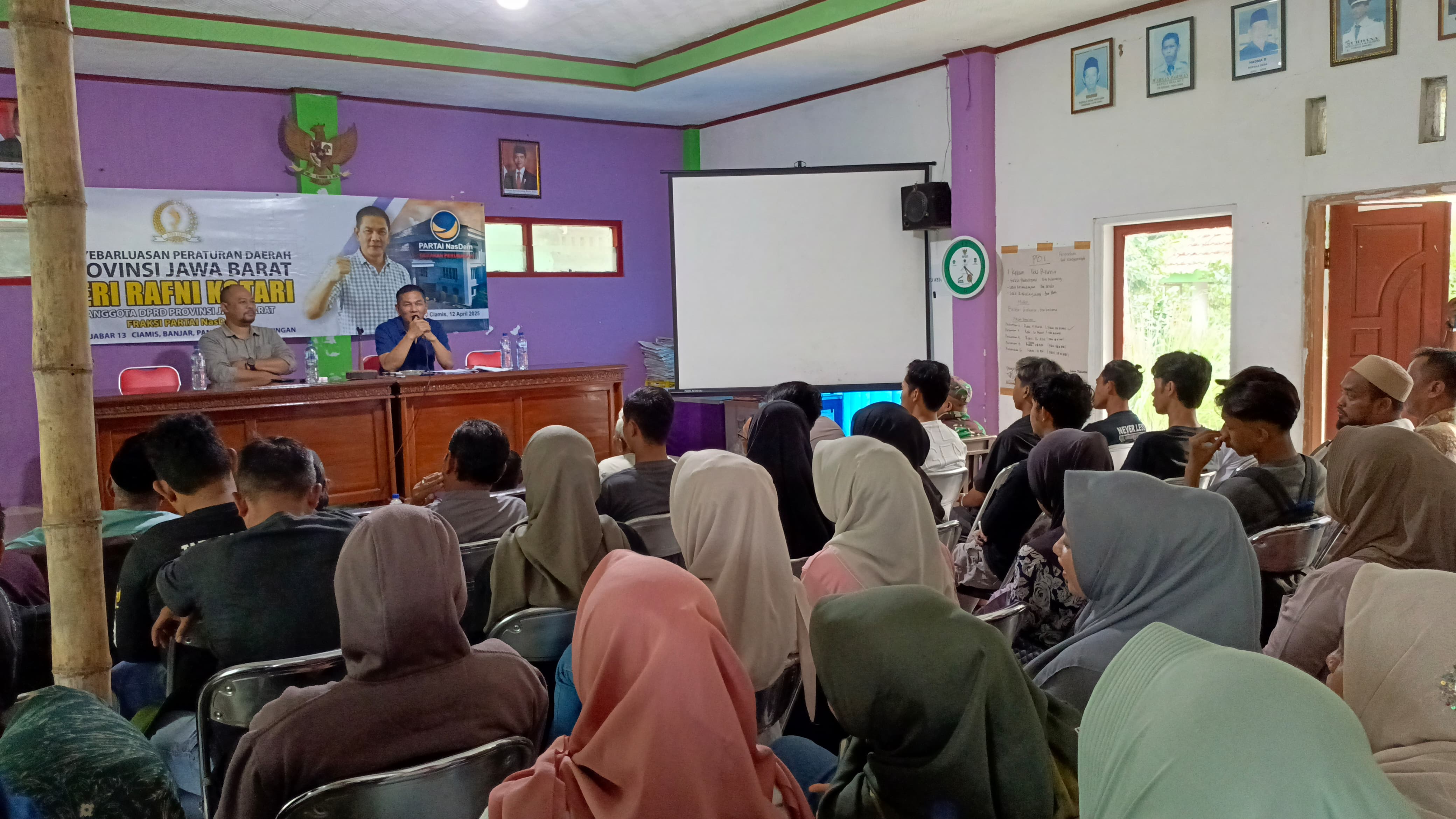 CIAMIS ~ Personel Polsek Ciamis Polres Ciamis Polda Jabar melaksanakan monitoring kegiatan sosialisasi peraturan daerah Provinsi Jawa Barat yang disampaikan oleh anggota DPRD Provinsi Jawa Barat di Desa Karangampel. Kegiatan ini dilaksanakan di Aula Kantor Desa Kaeangampel, Kecamatan Baregbeg, Kabupaten Ciamis, Jawa Barat, Sabtu, 12 April 2025, petang.